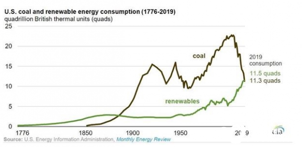 5月26日美國(guó)能源信息署(EIA)發(fā)布的《月度能源評(píng)論》顯示,2019年美國(guó)可再生能源消耗量自1885年以來首次超過煤炭,這比電力行業(yè)預(yù)測(cè)實(shí)現(xiàn)這一里程碑的時(shí)間還要早上一年。主要原因是過去十年來,由于廉價(jià)替代能源的崛起,煤炭的消耗量大幅下降。但在能源結(jié)構(gòu)中,可再生能源仍然遠(yuǎn)遠(yuǎn)落后于石油和天然氣等化石燃料,如果沒有頁巖氣繁榮帶來的廉價(jià)天然氣,美國(guó)的煤炭消費(fèi)可能仍將大大高于可再生能源消費(fèi)。